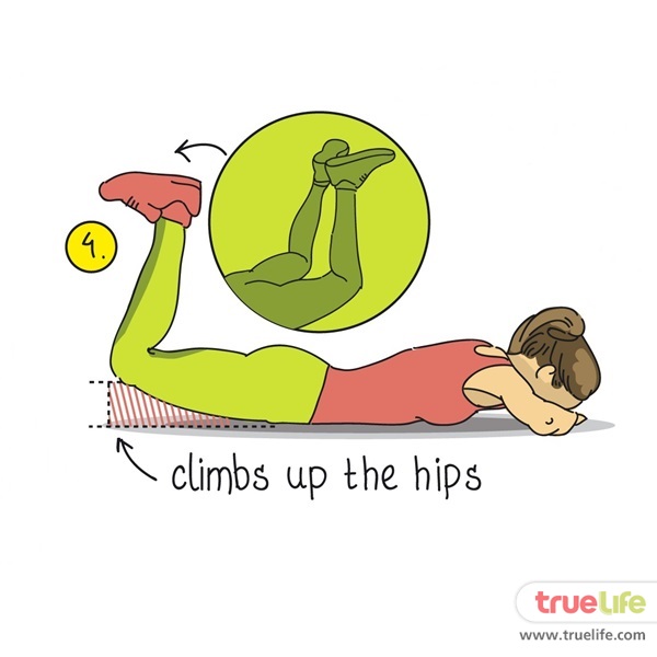 ท่าที่ 4 Climbs up the hips นอนคว่ำ ยกต้นขาลอยขึ้นจากพื้น