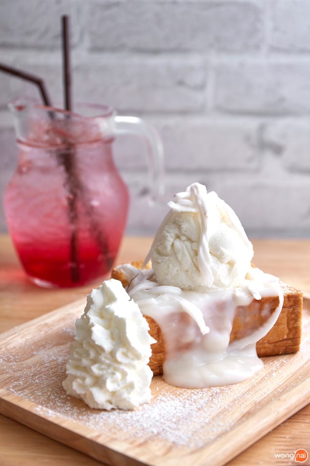 179- ขนมปังปิ้งกรอบๆ ชิ้นโตราดด้วยซอสมะพร้าวกับไอศกรีมกะทิ