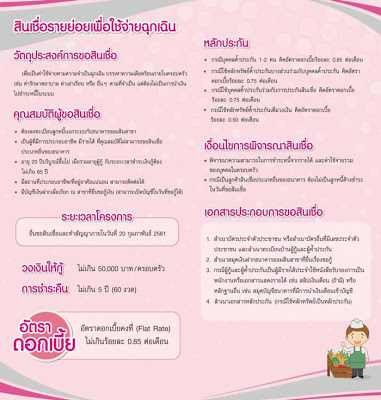 วงเงินให้กู้ 50,000 บาทต่อครอบครัวระยะเวลาโครงการยื่นขอสินเชื่อและทำสัญญาได้ถึงภายในวันที่ 20 ก.พ. 2561ระยะเวลาการผ่อนชำระหนี้คืนไม่เกิน 5 ปี หรือ 60 งวด