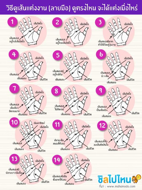 12. หากเส้นสมรสของใครมีการโค้งลงไปจนไปชนเส้นจิตใจหรือตัดผ่านเส้นจิตใจ ทำนายว่า คู่ครองของคนนั้นจะต้องตายจากไปก่อน เหตุการณ์จะเกิดขึ้นเร็วหรือช้าให้สังเกตดูตำแหน่งของเส้นสมรสว่าเกิดใกล้หรือไกลเส้นจิตใจ หากเส้นสมรสอยู่ใกล้เส้นจิตใจเหตุการณ์ก็จะเกิดเร็ว แต่ถ้าเส้นสมรสอยู่ห่างจากเส้นจิตใจเหตุการณ์ตายจากกันก็จะเกิดขึ้นช้า