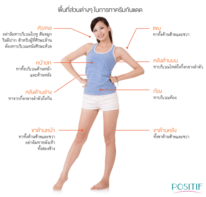 บีบครีมกันแดดเป็นเส้นหนาจากปลายนิ้วกลางถึงข้อมือ ปริมาณนี้สำหรับการทากันแดดในพื้นที่แต่ละส่วน