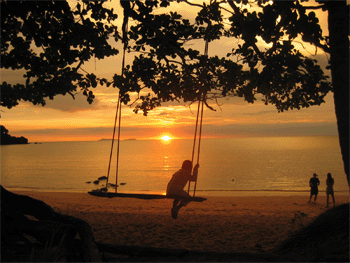 ตกเย็นหากใครที่หลงใหลในทิวทัศน์อาทิตย์อัสดง แล้วล่ะก็ สามารถเดินทางสูงฝั่งตะวันตก เป็นที่ตั้งของบ้านหลังเขาของเกาะลิบง ซึ่งบริเวณหาดจะมีเรือหางยาวของชาวบ้านจอดเรียงกันหลายลำ เบื้องหน้ามีเกาะเล็ก ๆ ตั้งอยู่บรรยากาศของวิถีตามธรรมชาติที่ปรากฏตรงหน้าสามารถสะกดให้หยุดนิ่งได้นานตราบเท่าแสงตะวันจะลับขอบฟ้า กับการเดินทางครั้งนี้ มีหลายสิ่งหลายอย่างของลิบง ที่สะกดผมให้นิ่งงันอยู่กับความสุขได้หลายอย่างทั้งภาพธรรมชาติที่ยังคงอุดมสมบูรณ์ ทั้งชายหาดขาว น้ำทะเลใส หมูแมกไม้ และสัตว์ทะเล รวมไปถึงมิตรไมตรีของผู้คนบนเกาะ สารภาพตามตรงว่า ผมหลงเสน่ห์ เกาะลิบง เข้าแล้วสิ