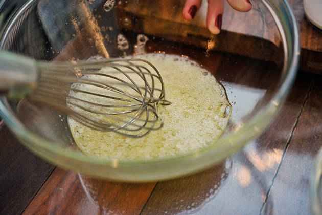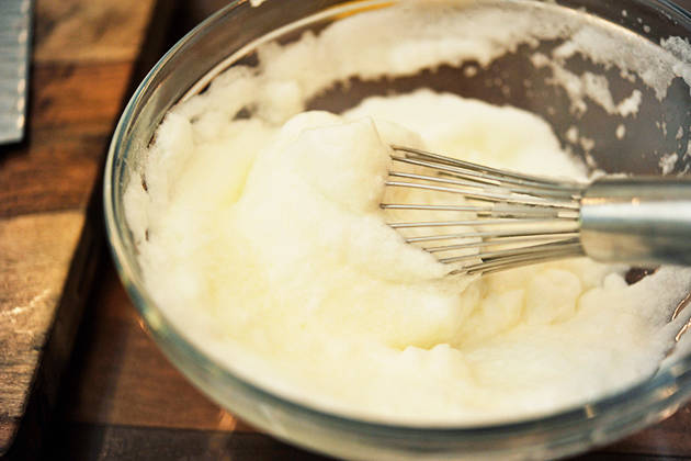 5. นำน้ำส้มสายชูกับไข่ขาวใส่ชามแล้วตีผสมกันให้เป็นฟอง
