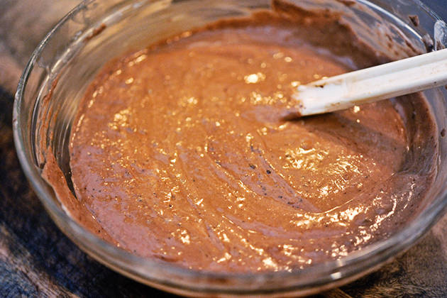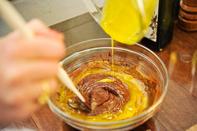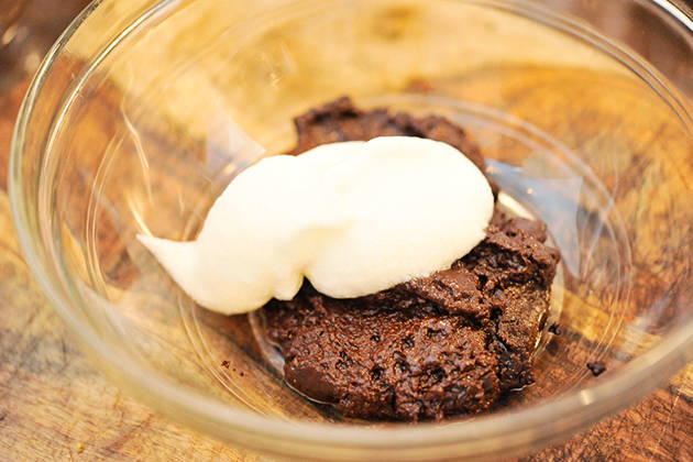 11. แบ่งส่วนผสมไข่ขาวออกเป็นสี่ส่วน ส่วนแรกเอาไปผสมกับช็อกโกแลตให้เข้ากันดี