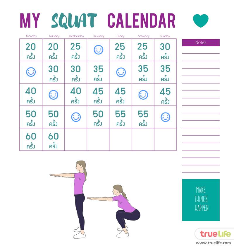 แต่ถ้าอยากให้ได้หุ่นสวยครบทุกสัดส่วน แน่นอนว่าทำท่านี้วันสองวันก็คงไม่พอค่ะ งานนี้ Women Society ก็เลยจัดตารางการทำสควอทมาให้กันแบบเต็มๆ 30 วัน! หากสาวๆ ทำวนตามตารางนี้ไปอย่างสม่ำเสมอทุกๆ เดือน รับรองว่า โบกมือลาก้นย้อยๆ ต้นขาเบียดๆ กันไปได้เลยย!