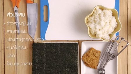 ข้าวปั้นแพนด้า ข้าวสวยญี่ปุ่น สาหร่ายแผ่น ฟองเต้าหู้ทอดต้มซีอิ๊ว หน่อไม่ฝรั่ง ปูอัด โชยุ และ วาซาบิ วิธีทำ 1. ใช้สกู๊ปไอศกรีมตักข้าว ปั้นให…