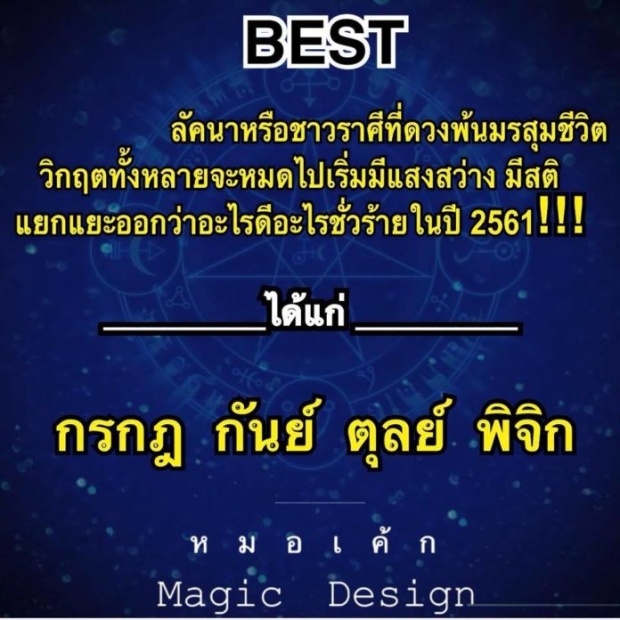 วันนี้ MarketJJ มีคำทำนายแม่นๆมาให้เพื่อนๆได้อัพเดทชีวิตกันเช่นเคย โดย หมอเค้ก Magic designs หมดดูชื่อดังในโลกโซเซียล ได้เผยแพร่ ดวงชะตาถึง 4 ราศี ผ่านทางเฟซบุ้คแฟนเพจ ว่า ดวงพ้นมรสุมชีวิต วิกฤตทั้งหลายจะหมดไป เริ่มมีแสงสว่าง มีสติ แยกแยะออกว่าอะไรดีอะไรชั่ว ในปี 2561 ซึ่งได้แก่ ราศีดังต่อไปนี้!