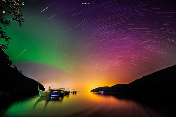 ดาวหมุนในช่วงค่ำกับแสงสีของไฟจากเรือปั่นที่ทำประมงอยู่ห่างเกาะ
