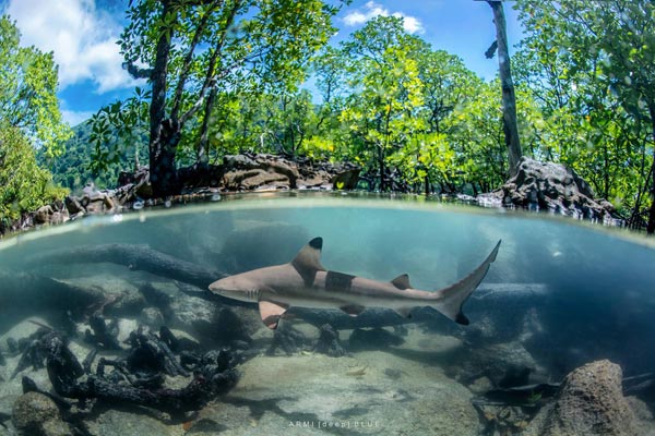 ฉลามหูดำที่ว่ายเวียนอยู่ในป่าโกงกางช่วงน้ำขึ้นเต็มที่