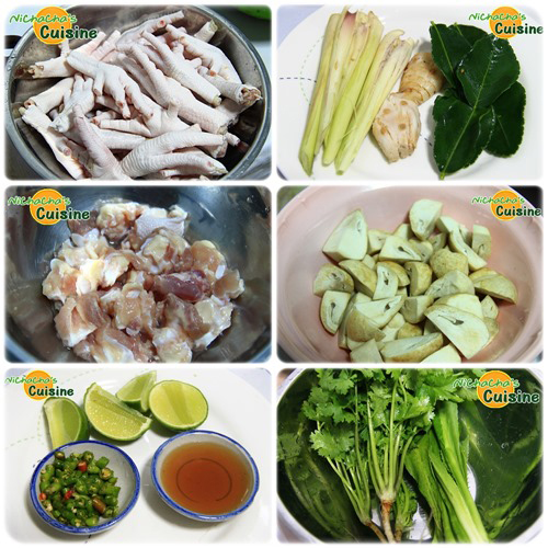 ขาไก่ 1 กิโลกรัม เอ็นข้อไก่ 200 กรัม เครื่องต้มยำ (ข่า ตะไคร้ ใบมะกรูด) เห็ดฟาง 8 ดอก พริกขี้หนูสวนซอย 50 กรัม ผักชี และผักชีใบเลื่อย อย่างละ 2 ต้น น้ำปลา 3 ช้อนโต๊ะ น้ำมะนาว 3 ช้อนโต๊ะ หอมแดง 5 หัว น้ำสำหรับต้ม
