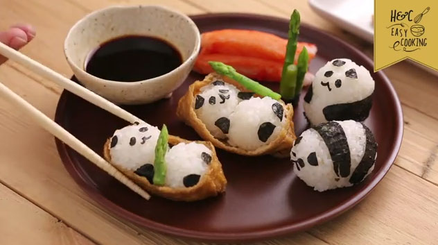 2. ตัดสาหร่ายเป็นหู ตา จมูก ปาก และ แขน ของแพนด้า