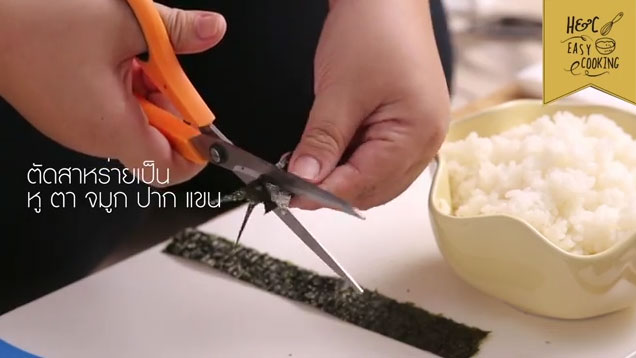 3. วางข้าวซ้อนกันแล้วติดสาหร่ายที่ตัดไว้ให้สวยงาม