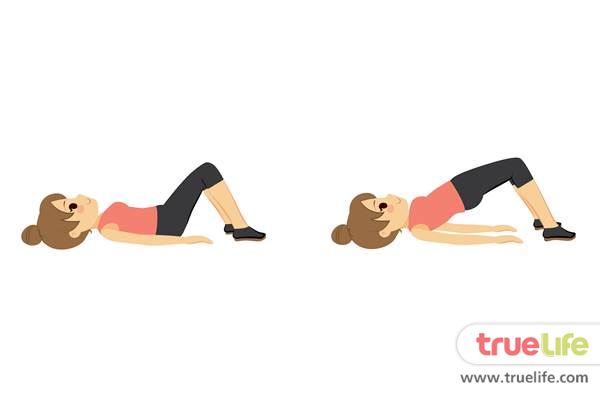 5.2 กดมือทั้งสองข้างลงกับพื้น แล้วยกลำตัว สะโพก และขาขึ้นลอยขึ้นจากพื้นให้สูงที่สุดเท่าที่จะทำได้ พยายามให้ช่วงลำตัวและต้นขาเหยียดตรง ค้างไว้ 3 วินาที แล้วค่อยๆ ปล่อยลำตัวลงกลับสู่ท่าเริ่มต้น