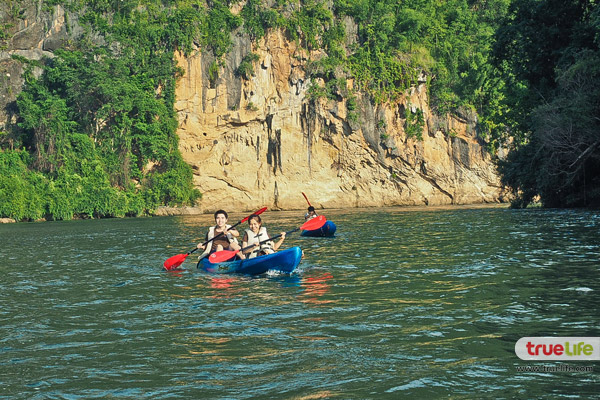 ของแม่น้ำแควช่วงใกล้พระอาทิตย์ตกดิน หรือถ้าใครอยากพายเรือคายัคก็สามารถ