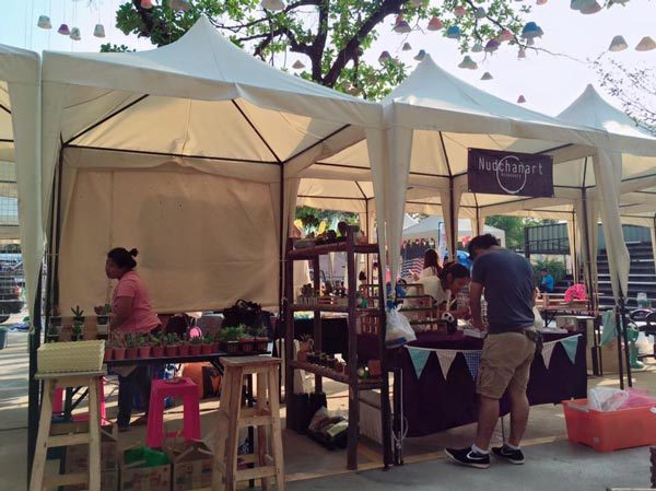 ถัดจากทางเข้าสะดุดตากับเต็นท์ขายของสีขาวที่เรียงรายอย่างเป็นระเบียบ
