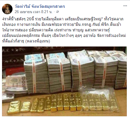 ราศีไหน ดวงดี มีเกณฑ์จะได้เป็นเศรษฐีคนต่อไป รีบมาเช็กพร้อมกันเลยจ้า!!! โดย หลวงพี่อุเทน วัดท่าไม้ ได้ชี้ดวงชะตาของ 4 ราศี ผ่านทางเฟสบุ้ค วัดท่าไม้ จังหวัดสมุทรสาคร ว่า มีเกณฑ์จะร่ำรวย ได้เป็นเศรษฐีใหญ่ ซึ่งได้แก่ ราศีมีน ราศีกรกฏ ราศีกันย์ และราศีพิจิก พร้อมกับระบุว่า