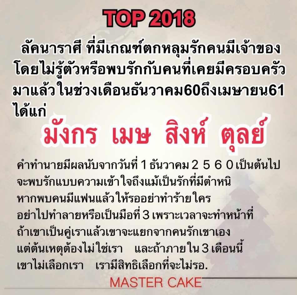 คำทำนายนี้มีผลนับจากวันที่ 1 ธันวาคม 2560 เป็นต้นไป 4 ราศีได้แก่ ราศีมังกร ราศีเมษ ราศีสิงห์ และราศีตุลย์ มีเกณฑ์ตกหลุมรักคนมีเจ้าของโดยไม่รู้ตัว หรือพบรักกับคนที่เคยมีครอบครัวมาแล้ว