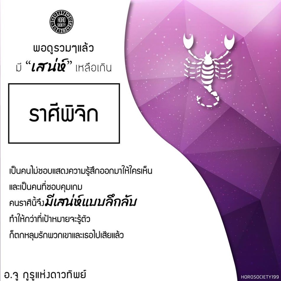 ราศีพิจิก – เพราะเป็นคนไม่ชอบแสดงความรู้สึกออกมาให้ใครเห็น และเป็นคนที่ชอบคุมเกม คนราศีนี้จึงมีเสน่ห์แบบลึกลับ ทำให้กว่าที่เป้าหมายจะรู้ตัว ก็ตกหลุมรักพวกเขาและเธอไปเสียแล้ว