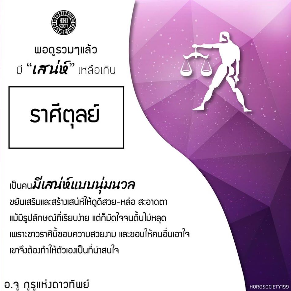 ราศีตุลย์ – เป็นคนมีเสน่ห์แบบนุ่มนวล ขยันเสริมและสร้างเสน่ห์ให้ดูดีสวย-หล่อ สะอาดตา แม้มีรูปลักษณ์ที่เรียบง่าย แต่ก็มัดใจจนดิ้นไม่หลุดเพราะชาวราศีนี้ชอบความสวยงาม และชอบให้คนอื่นเอาใจ เขาจึงต้องทำให้ตัวเองเป็นที่น่าสนใจ