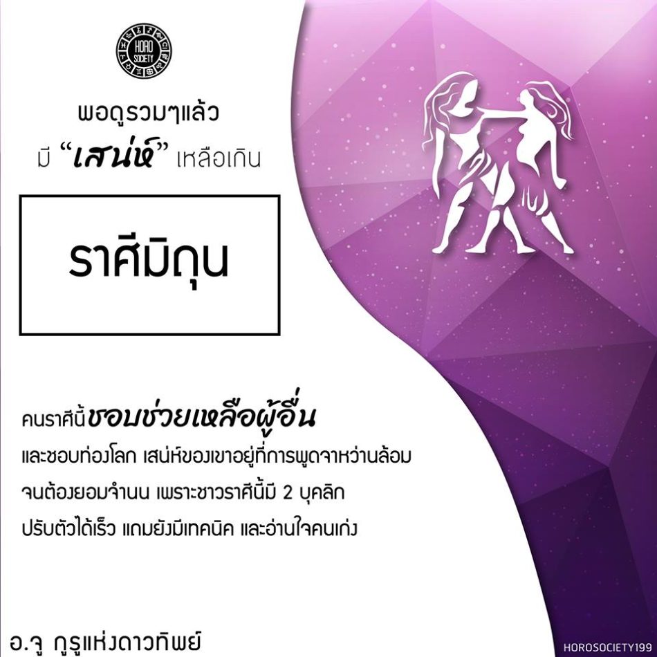ราศีมิถุน – คนราศีนี้ชอบช่วยเหลือผู้อื่น และชอบท่องโลก เสน่ห์ของเขาอยู่ที่การพูดจาหว่านล้อมจนต้องยอมจำนน เพราะชาวราศีนี้มี 2 บุคลิก ปรับตัวได้เร็ว แถมยังมีเทคนิค และอ่านใจคนเก่ง