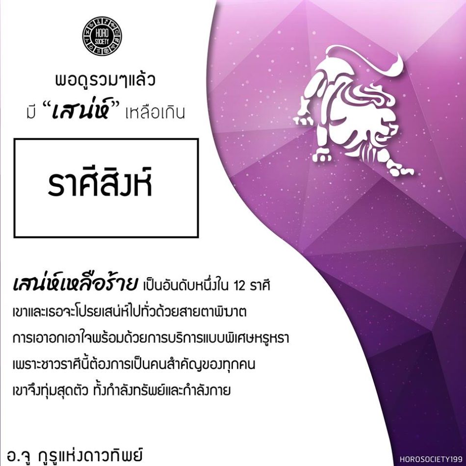 ราศีสิงห์ – เสน่ห์เหลือร้าย เป็นอันดับหนึ่งใน 12 ราศี เขาและเธอจะโปรยเสน่ห์ไปทั่วด้วยสายตาพิฆาต การเอาอกเอาใจพร้อมด้วยการบริการแบบพิเศษหรูหรา เพราะชาวราศีนี้ต้องการเป็นคนสำคัญของทุกคน เขาจึงทุ่มสุดตัว ทั้งกำลังทรัพย์และกำลังกาย
