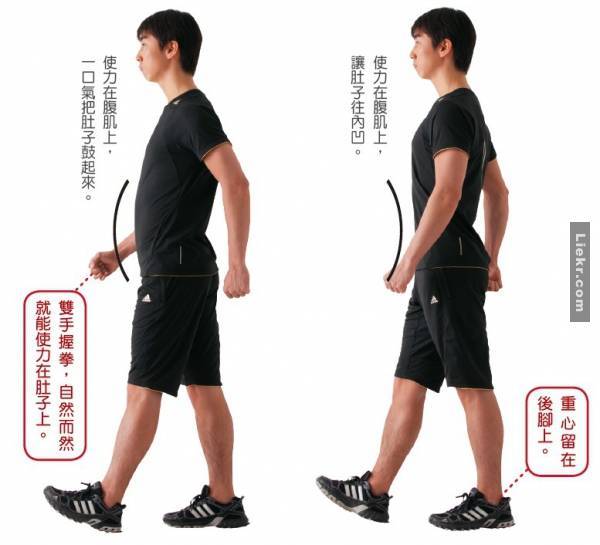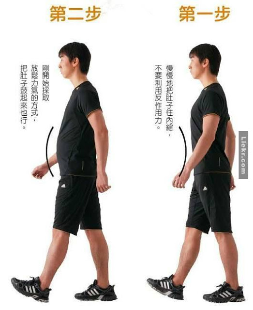 เมื่อก้าวเท้าขวา ให้นับ 1 พร้อมเกร็งหน้าท้อง พอก้าวเท้าซ้าย ให้นับ 2 ปล่อยหน้าท้องให้สบายๆไม่ต้องเกร็ง ทำแบบนี้สลับกันไปเรื่อยๆ