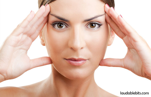 เคลื่อนมือออกไปผ่านบริเวณคิ้วทั้งสองข้างจนถึงขมับ