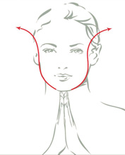 และนิ้วโป้งบริเวณต้นคอ ค่อยๆ คลายฝ่ามือออกไปตามแนวคางทั้งสองด้าน