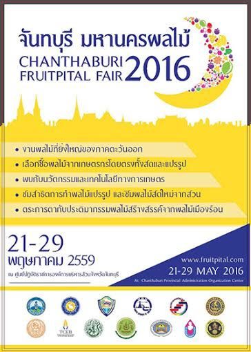 พลาดไม่ได้กับงานรวมผลไม้ทั้งภาคตะวันออกมาไว้ที่นี่ที่เดียวกับ งานจันทบุรี มหานครผลไม้ ประจำปี 2559 (CHANTHABURI FRUITPITAL FAIR 2016) ครั้งที่ 4 ระหว่างวันที่ 21-29 พฤษภาคม 2559 ณ ศูนย์ปฏิบัติราชการองค์การบริหารส่วนจังหวัดจันทบุรี จังหวัดจันทบุรี