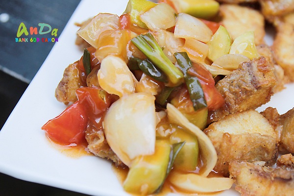 วิธีทำ โขลกรากผักชีกับกระเทียมและพริกไทย จากนั้นนำไปผัดในกระทะจนหอม ปรุงรสด้วยน้ำมันหอย น้ำตาลทราย และซีอิ๊วขาว ชิมรสให้ออกเค็ม-หวาน จากนั้นนำชิ้นปลาทอดกรอบลงไปผัดให้เข้ากัน พร้อมเสิร์ฟ เมนูที่ 3 : ปลาทอดราดซอสเปรี้ยวหวาน
