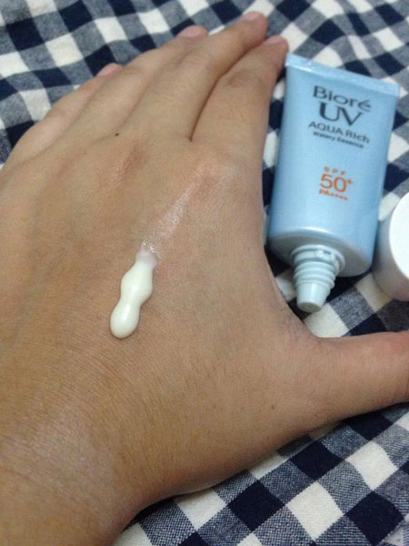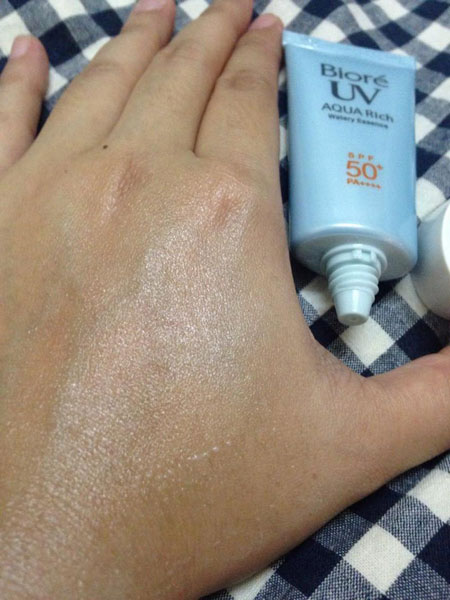 ปรากฏว่า ลองเทสเนื้อเค้าดู เธอดูสิ เนื้อเอสเซ้นส์คือแบบนี้เองหรอ ดีงามมากซึมไปเลยอ่ะแตกตัวเป็นละอองน้ำแล้วก็ซึมง่ายๆแบบนี้ ทำไมไม่ใช้ตั้งแต่แรก! คือ มันดีตรงทีพอซึมแล้วมันแห้งเข้าผิวทำให้เราแต่งหน้าง่ายขึ้นเพราะปกติครีมกันแดดเนื้อจะค่อนข้างเหนียว ทาแล้วก็แต่งหน้าลำบางไรงี้ และที่สำคัญกันน้ำดีเริ่ดเอาไจพี่ไปเลยจ้า แนะนำเลยนะสาวๆ ควรมี ควรลอง ควรใช้ จบนะ!