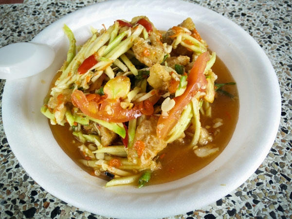 แคบหมู (ตามชอบ)          พริกขี้หนูสวน (ตามชอบ)                  กระเทียมปอกเปลือก 50 กรัม          กุ้งแห้ง 50 กรัม          ถั่วลิสงคั่ว 100 กรัม          ถั่วฝักยาว (หั่นท่อน) 200 กรัม          น้ำตาลปี๊บ 2 ช้อนโต๊ะ          น้ำปลา 2 ช้อนโต๊ะ          น้ำมะนาว 2 ช้อนโต๊ะ          มะละกอสับ 100 กรัม          มะเขือเทศราชินี (หั่นเป็นชิ้นเล็ก ๆ) 3 ลูก