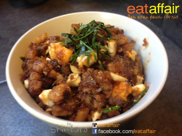 9. ใส่กากหมูลงไปผัดแล้วปิดไฟ ผัดผสมให้เข้ากัน