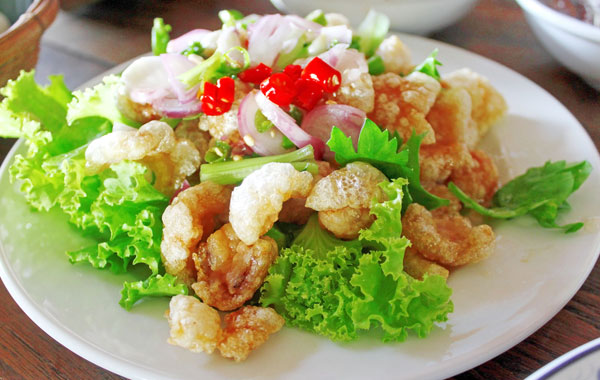 3. วางเรียงผักกาดหอมลงในจาน ตามด้วยแคบหมู เทน้ำยำราดลงไปให้ทั่ว พร้อมเสิร์ฟ