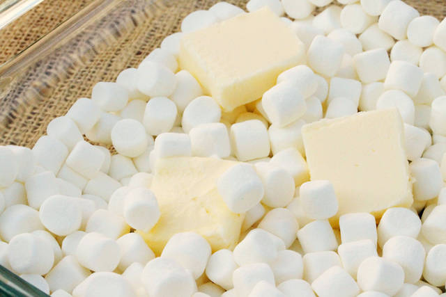 5. เอาเข้าอบในไมโครเวฟประมาณ 3 นาทีจนมาชเมลโลว์และเนยละลายดี จากนั้นนำมาราดบนซีเรียล