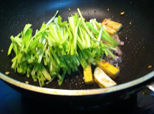 จากนั้นใส่กุยช่ายขาวหั่นท่อนลงไป เติมน้ำเปล่าเล็กน้อย
