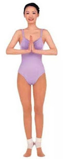 Step 1 : เตรียมพร้อมยืนตัวตรงหลังตรง เขย่งปลายเท้าพนมมือตรงหน้าอก จะช่วยให้หลังตรงรักษาสมดุล ให้ยืนนิ่ง ๆ ได้