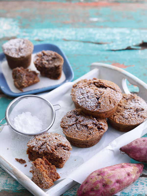 มันต่อเผือกอบสุก (ขูดเอาแต่เนื้อ) 200 กรัม          กล้วยหอม 100 กรัม          เนยถั่ว หรือเนยอัลมอนด์ 2/3 ถ้วยตวง          น้ำเชื่อมเมเปิล 1/4 ถ้วยตวง          อบเชยป่น 1/2 ช้อนชา          ขิงผง 3/4 ช้อนชา          ออลสไปซ์ 1/2 ช้อนชา          ลูกจันทน์ป่น 1/4 ช้อนชา          ผงฟู 2 ช้อนชา          น้ำตาลไอซิ่งสำหรับโรย