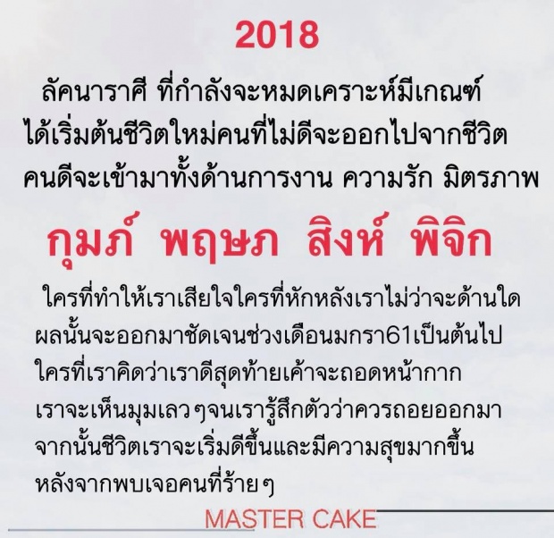 หมอเค้ก เผยว่า “บทเรียนที่ผ่านมาไม่จำเป็นต้องลืม แต่จงควรจำ อย่าให้อภัยคนที่ทำร้ายเราซ้ำซาก แต่จงอโหสิกรรมแล้วเดินออกมา เรารู้อยู่แก่ใจตัวเองอยู่แล้ว จากนี้ไปขอให้เจอสิ่งที่ดี เริ่มต้นปีใหม่ที่มีความสุข พบเจอเรื่องราวดีๆในชีวิต อย่าพบเจอคนทำลายเราเลย ยิ่งเราเป็นคนที่ใจอ่อนสุดท้ายก็โดนทำร้ายซ้ำๆ โดนเอาเปรียบบางทีไม่รู้ตัวด้วยซ้ำ หรือรู้ตัวแต่พูดไม่ได้ เอาร่ะ…ครับไม่ต้องพูดอะไร เดินออกมาก็จบ ความรักถ้าจะเริ่มต้นมีรักกับคนที่ดี คงจะดีกว่าที่เป็นอยู่ อยู่กับรักที่ซ้ำซาก อย่ากลัวที่จะเดินออกมา มิตรภาพเช่นกัน เพื่อนที่รักเราจะไม่ทำอะไรลับหลัง เช่น นินทา การงานแน่นอนว่าเพื่อนร่วมงาน เจ้านายลูกน้องบริวารเราจะได้เห็น เห็นคน ! คนที่เอาเปรียบคนอื่น เราจะเห็น แล้วเราจะตัดสินใจได้เองว่าจะทำอย่างไร ช่วงเดือนธันวาคม2560 ควรหาเวลาพักผ่อน ไหว้พระทำบุญเป็นเกราะป้องกันสิ่งที่ทำร้ายเรา โดยเฉพาะความคิดตัวเองอย่าให้มันมาทำร้ายเราได้อีก จงมี สติ”