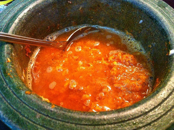 จากนั้นก็ตักน้ำซุปเดือด ๆ ส่วนหนึ่งลงมาในครกที่มีพริกแกง ใช้ทัพพียี ๆ ให้พริกแกงไม่จับเป็นก้อน