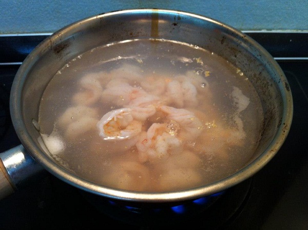 จากนั้นลวกกุ้งในน้ำเดือดจนสุก แล้วเทน้ำทิ้งไปค่ะ