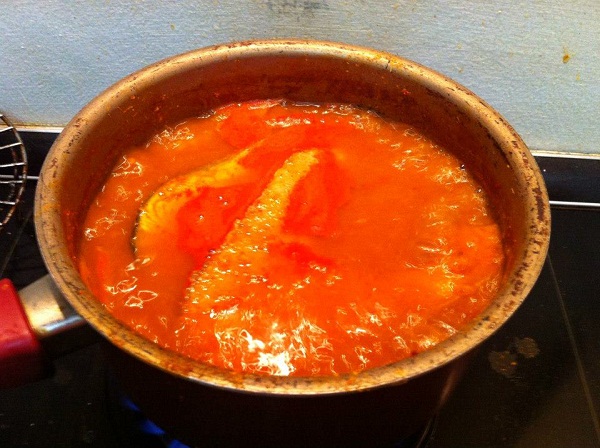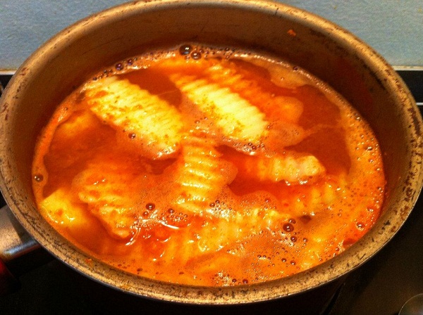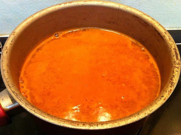 จากนั้นก็ตักพริกแกงใส่ลงไปในน้ำซุป ตั้งน้ำจนเดือด ลดไฟลง แล้วต้มซักพักให้งวดเล็กน้อย