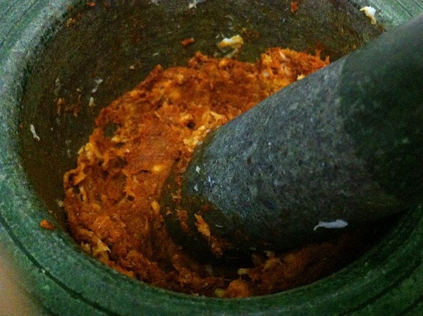 ใส่เครื่องแกงลงไปตำด้วย เติมกะปิลงไปนิดหนึ่ง