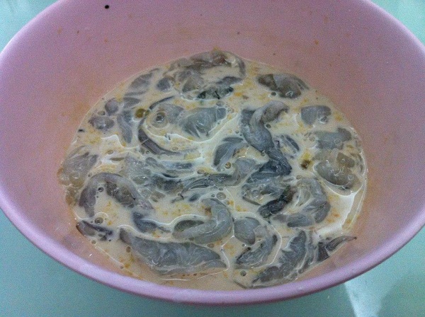 ผสมแป้งข้าวโพดกับเกลือและน้ำเปล่า แกะกุ้งผ่าหลังดึงเส้นดำออก จากนั้นแช่ในส่วนผสมน้ำแป้งซักครู่ ทั้งนี้เพื่อลดความคาวและช่วยให้กุ้งเด้งด้วยค่ะ