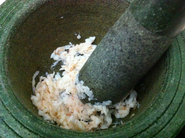 ขั้นตอนต่อไปนำกุ้งไปตำในครกจนละเอียด