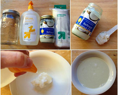 – ขวดโหลเอาไว้ใส่ (แนะนำว่าเป็นขวดแก้วดีกว่านะคะ) – สำลี เลือกเแผ่นกลมหรือแผ่นสี่เหลี่ยมก็ได้ตามชอบค่ะ แต่ขอแบบหนาหน่อยนะไม่เอาเนื้อยุ่ยง่ายนะจ๊ะ เดี่ยวจะเช็ดไม่สะอาด – น้ำมันมะพร้าวสกัดเย็น- สบูเหลวของเด็กสูตนอ่อนโยน สำหรับผิวบอบบางนะคะ