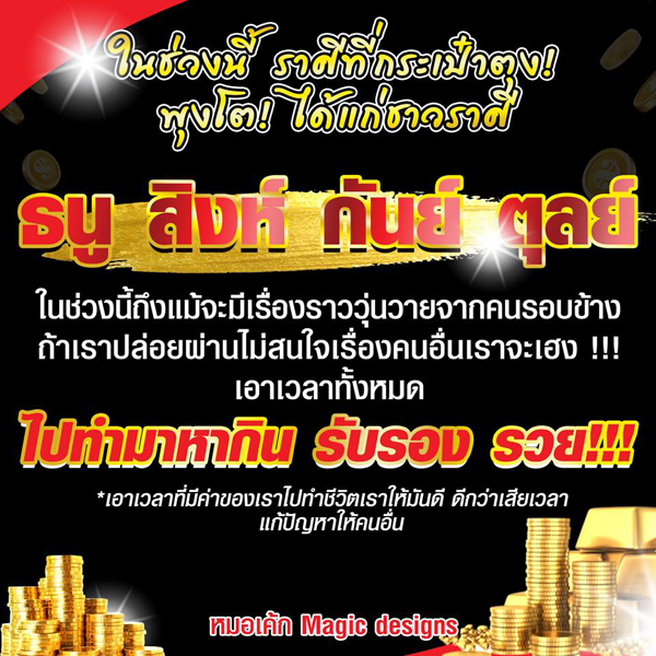 ซึ่งหมอเค้ก ได้ทำนายไว้ว่า “ในช่วงนี้ ราศีที่กระเป๋าตุง! พุงโต! ได้แก่ราศี ธนู สิงห์ กันย์ ตุลย์ ในช่วงนี้ถึงแม้จะมีเรื่องราววุ่นวายจากคนรอบข้าง ถ้าเราปล่อยผ่านไม่สนใจเรื่องคนอื่นเราจะเฮง!!! เอาเวลาทั้งหมดไปทำมาหากิน รับรอง รวย!!! *เอาเวลาที่มีค่าของเราไปทำชีวิตเราให้มันดี ดีกว่าเสียเวลาแก้ปัญหาให้กับคนอื่น”