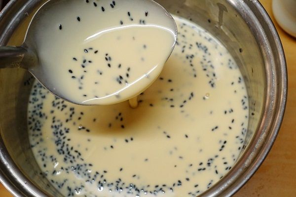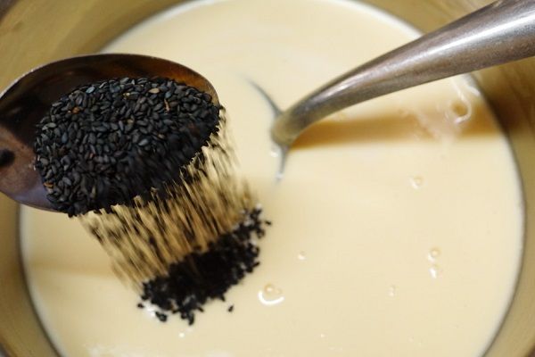 5. เมื่อคนจนแป้งไม่มีเม็ด หรือถ้ามีก็ให้กรองจนได้เนื้อเนียน ใส่งาดำลงไป 1 ช้อนกินข้าว