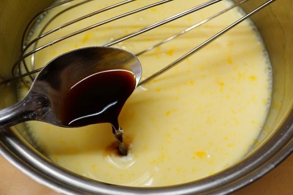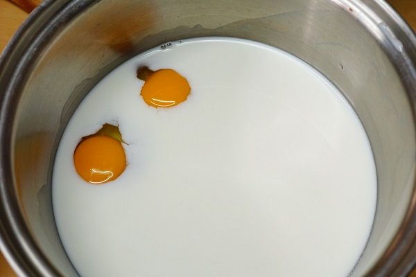 1. เทนมสด ไข่ไก่ และน้ำตาลทรายลงในหม้อ คนผสมให้เข้ากัน