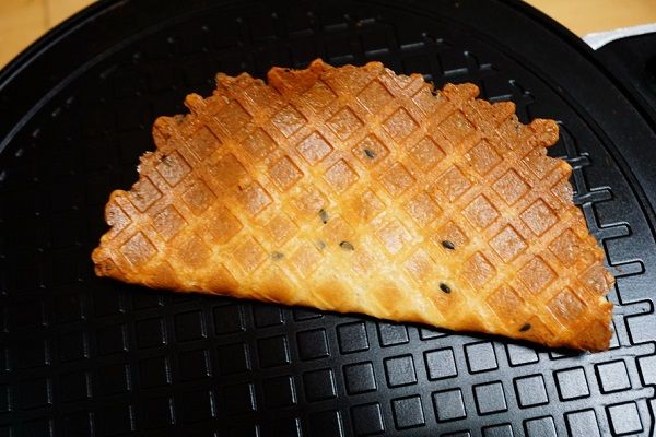 12. แล้วพับครึ่งอีกครั้ง โดยใช้ไม้เล็ก ๆ กดเล็กน้อย ขั้นตอนนี้ควรทำอย่างว่องไวภายใน 10 วินาที เพราะแป้งจะกรอบไวมาก เดี๋ยวจะพับไม่ได้